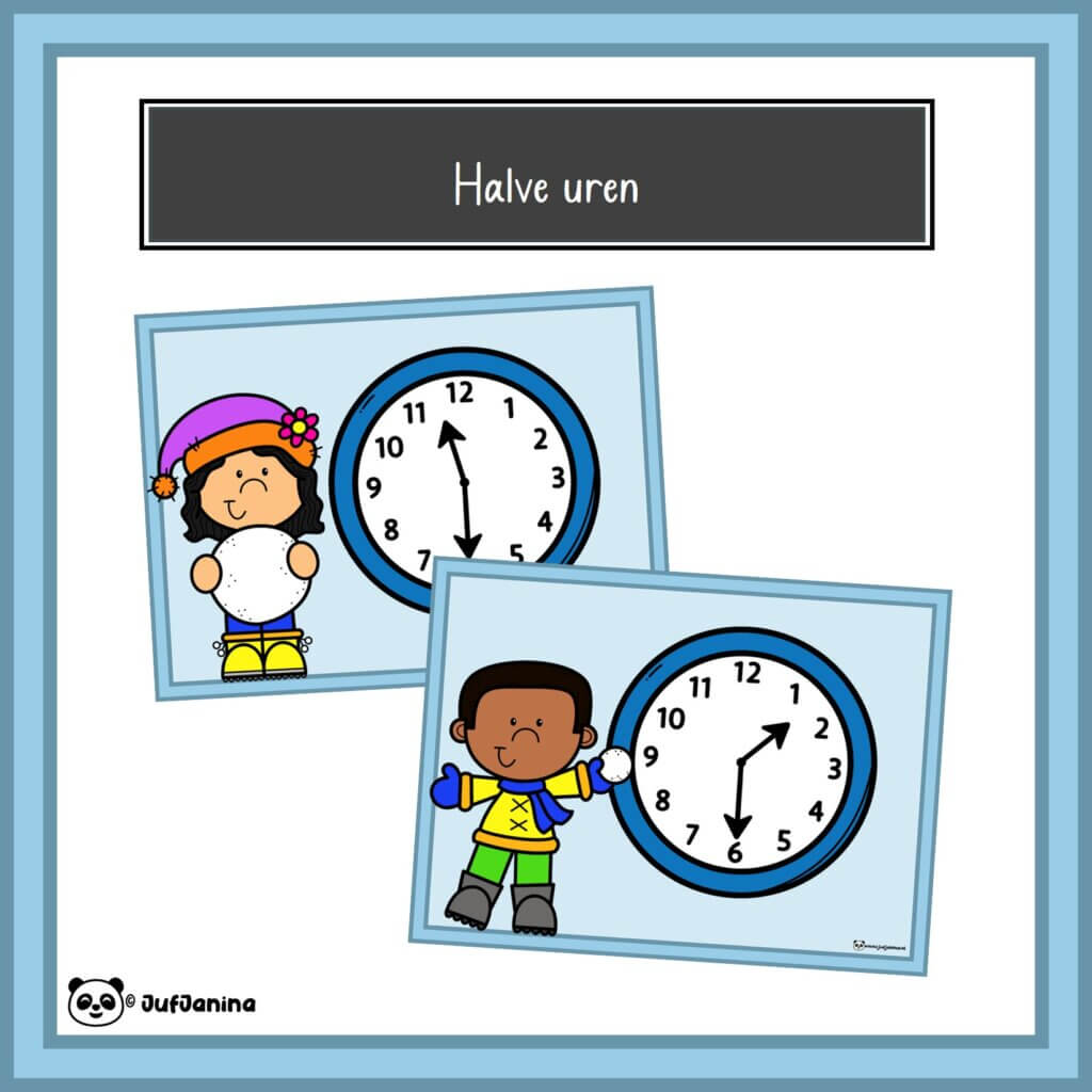 Met deze actieve werkvorm oefenen de kinderen op een leuke en actieve manier het klokkijken van hele en halve uren. Elk bestand bevat 10 kleurrijke kaarten met daarop een klok met de tijd in hele of halve uren. De kinderen moeten op het invulblad de juiste tijd invullen die ze op de klok zien staan.