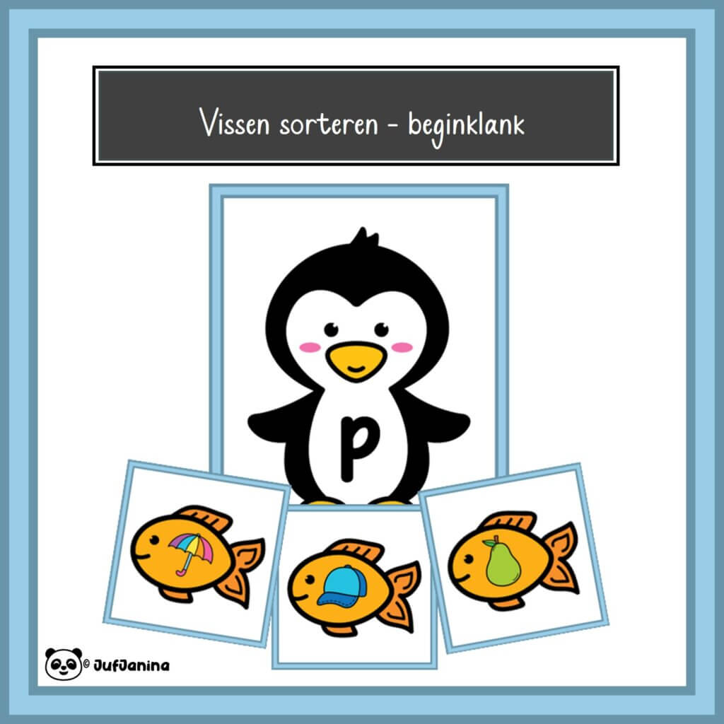 Met deze activiteit gaan de kinderen de vissen bij de juiste beginklank sorteren. Op elke vis staat een plaatje van een voorwerp dat begint met de klank p, w, s en r. Zo hoort een vis met een plaatje van een peer bij de pinguïn met de letter p op zijn buik.